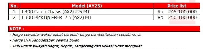 Meskipun begitu, harganya masih tergolong terjangkau, apalagi dengan spesifikasi performa yang cukup bertenaga. Harga mobil L300 baru sekitar 200 jutaan rupiah. Namun ketetapan harganya tergantung dari varian yang ingin seseorang beli.